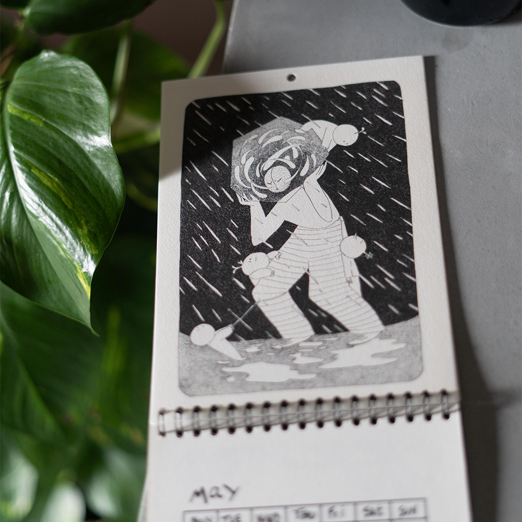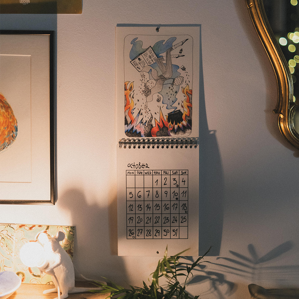 Calendar 2026. Limited edition and made by hand with love. This calendar is a compilation of handmade drawings made for Inktober 2025 with ink and pencil color.